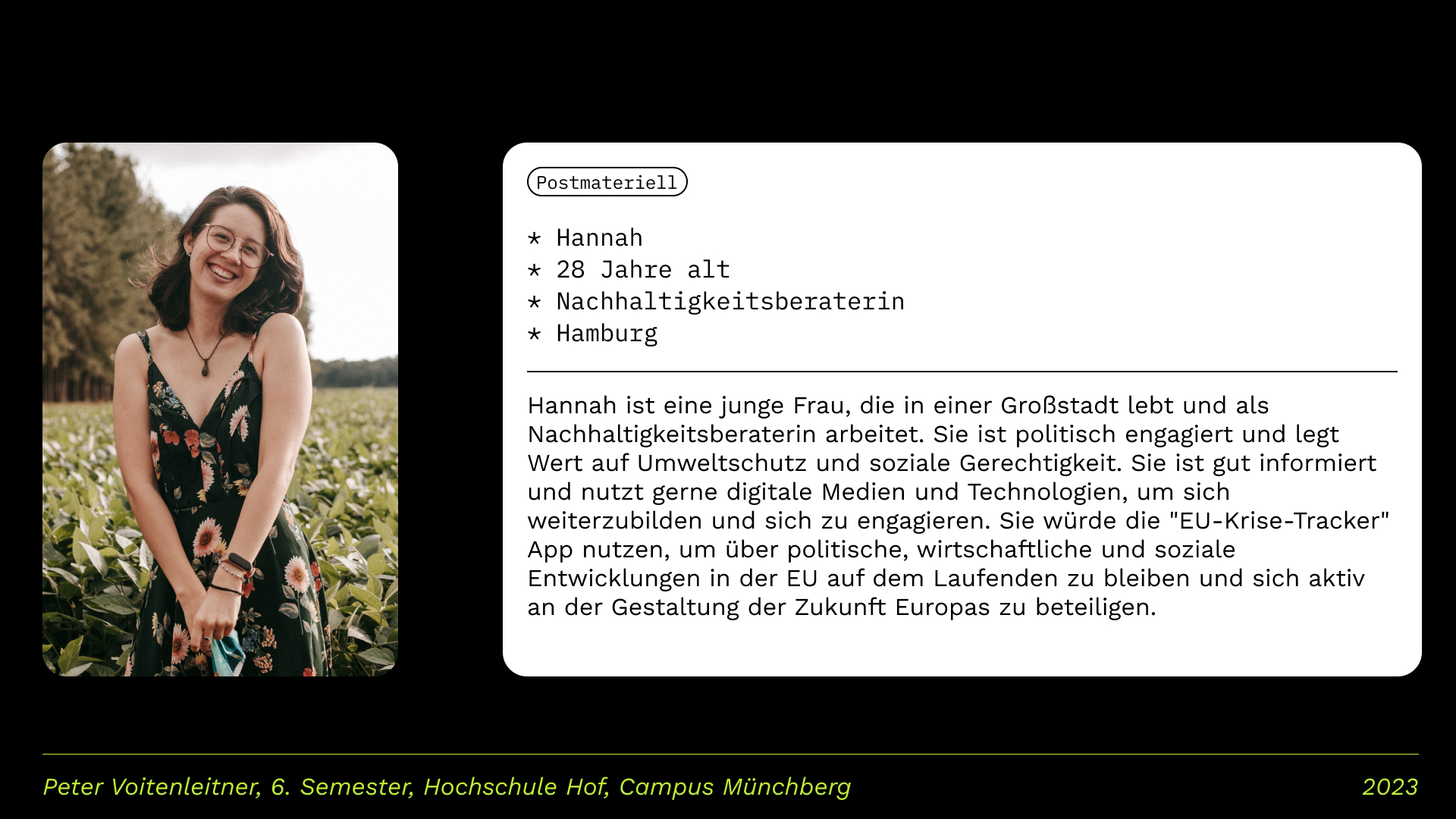 Basierend auf dem Sinus-Milieu gehören zur Zielgruppe vor allem Menschen aus den Milieus „Postmaterielle“, „Expeditives“ und „Neoökologische“. Diese Milieus zeichnen sich durch ein hohes Interesse an politischen und gesellschaftlichen Themen aus und legen Wert auf Nachhaltigkeit und Umweltschutz. Sie sind auch häufig gut informiert und nutzen gerne digitale Medien und Technologien, um sich weiterzubilden und zu engagieren.