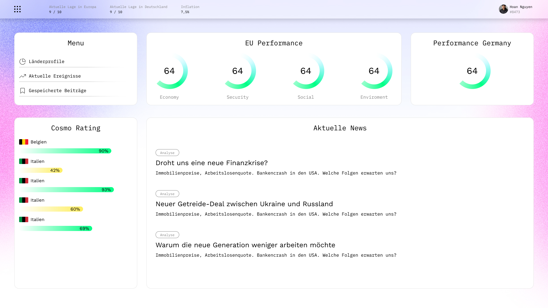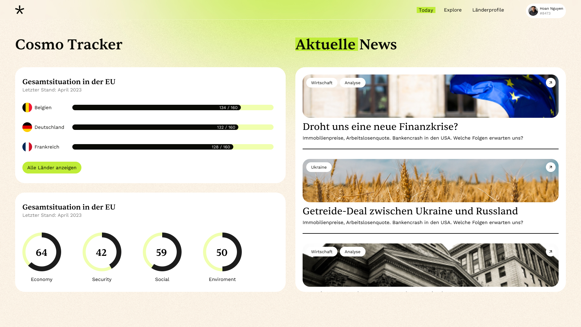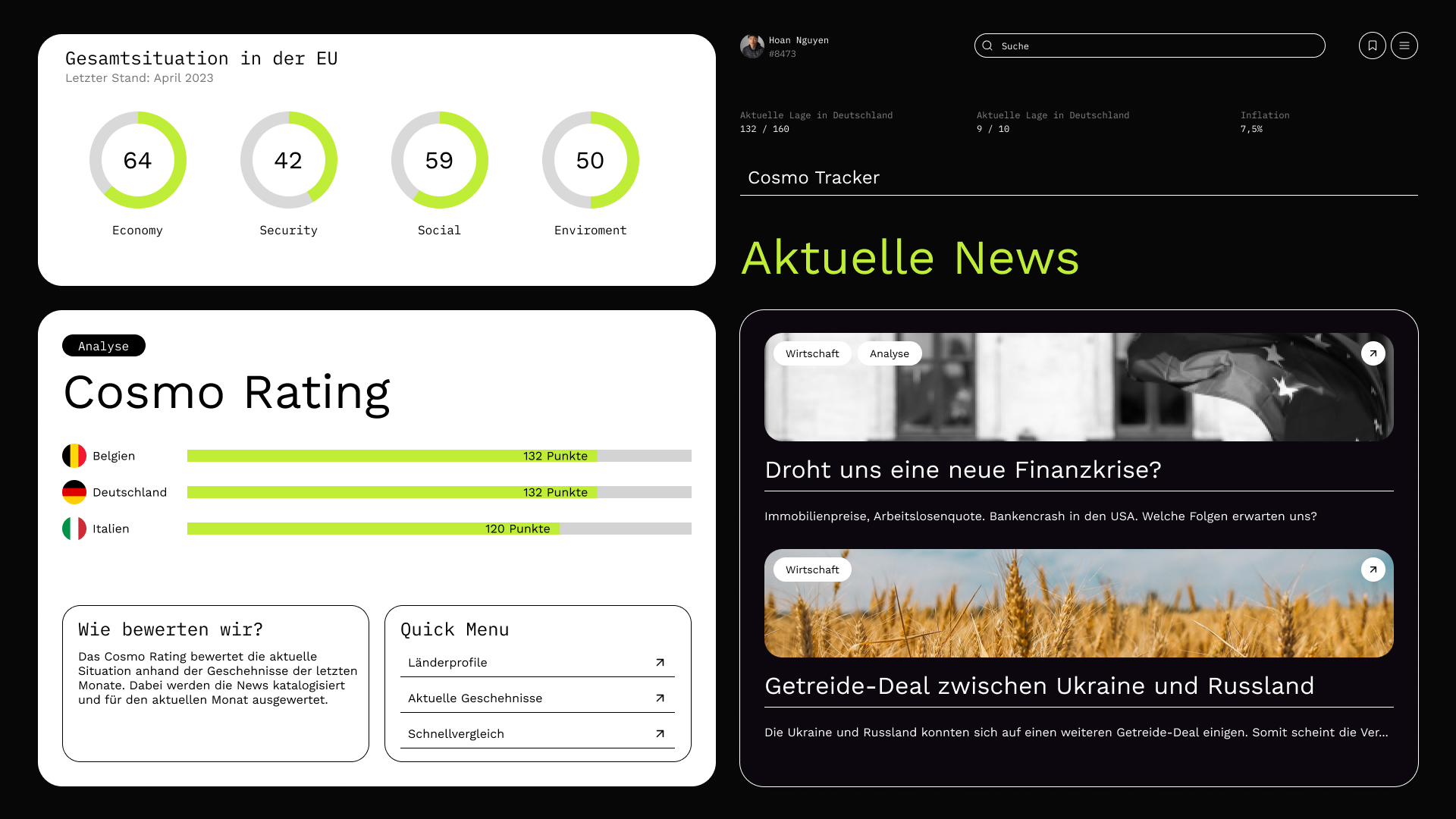 „Cosmo“ ist eine WebApp, welche verschiedene Indikatoren und Messgrößen verwendet, um die Lage in der EU zu bewerten, wie bspw. politische Stabilität, wirtschaftliche Leistungsfähigkeit, soziale Gerechtigkeit und Umweltschutz.